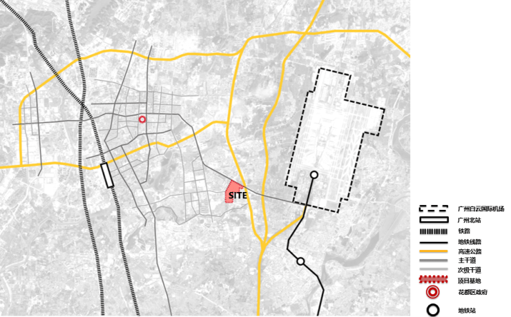 绿地香港广州国际空港中心位于广州市花都区南部,地铁九号线清塘站上盖,距离白云国际机场约3km,花都区政府约7km,广州市中心约22km,项目地块北临花都迎宾大道,东靠106国道。项目主要设计范围是写字楼。