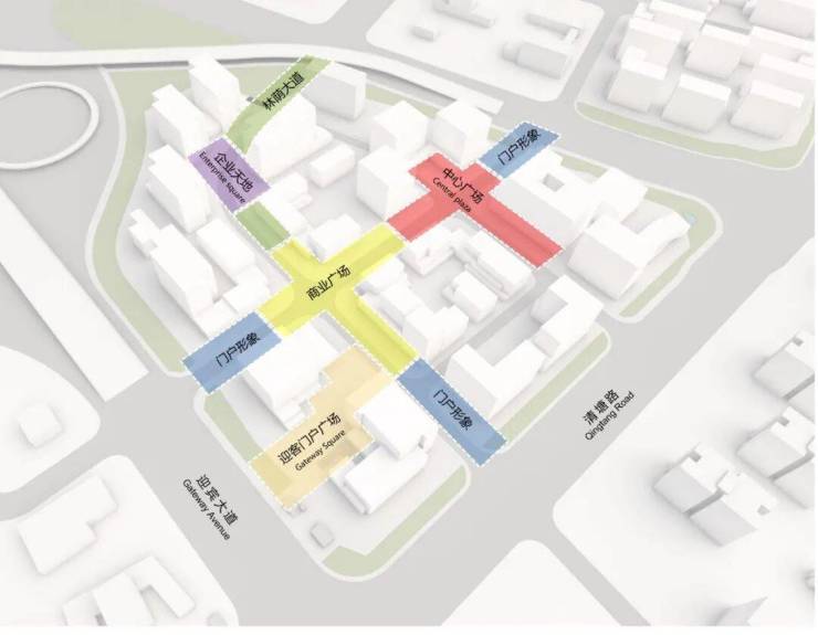 建筑整体的空间设计围绕入口主广场展开,通过体块的组合,形成中式传统合院式建筑空间,中间是政务办公大楼,南侧是东航办公和空港委办公,3栋楼围合共同形成一个入口主广场。