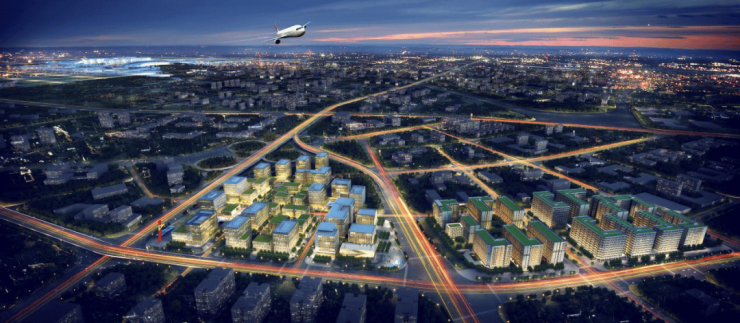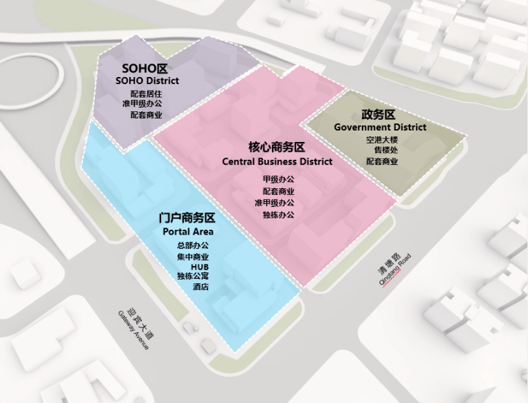 由于项目其中一处地块为空港委所用,因此整体设计以现代手法延续东方美学,将政府办公仪式感与空港未来科技感进行完美融合,两者相辅相成,形成独一无二的城市封面。