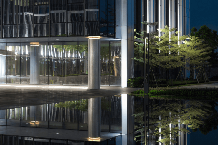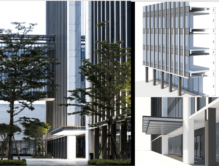 两侧的办公楼,面向水池的立面采用全玻璃幕墙设计,入口位于架空层之下,三栋建筑的落客区共享一个入口主广场,而主楼的立面通过运用三种立面线条,巧妙地创造变化,形成强烈的空间感。