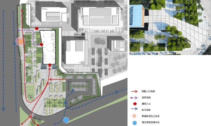 位于道路交叉口的空港委展示中心,作为项目重点,以“起航”、“跑道”为主题。