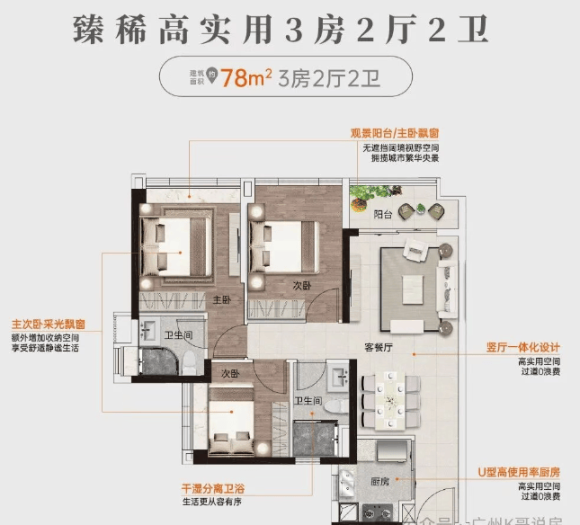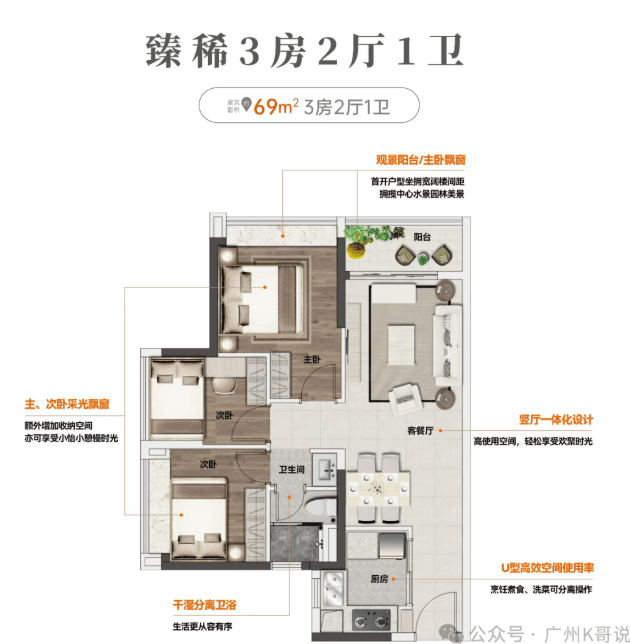 约69㎡真三房:三房两厅一卫,U型厨房、干湿分离卫浴、阔景阳台直面园林水景,小户型也能拥有大格局;