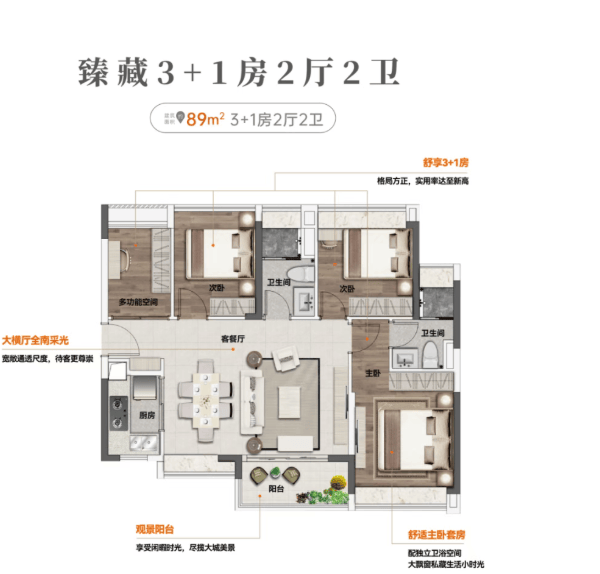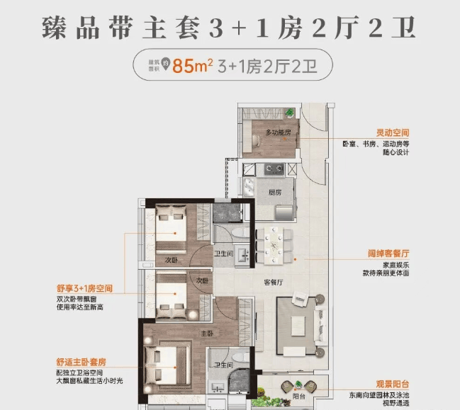 约85㎡四房两卫:带主卧套房,东南向望园林与星空泳池,双次卧均配飘窗,功能与颜值并存;
