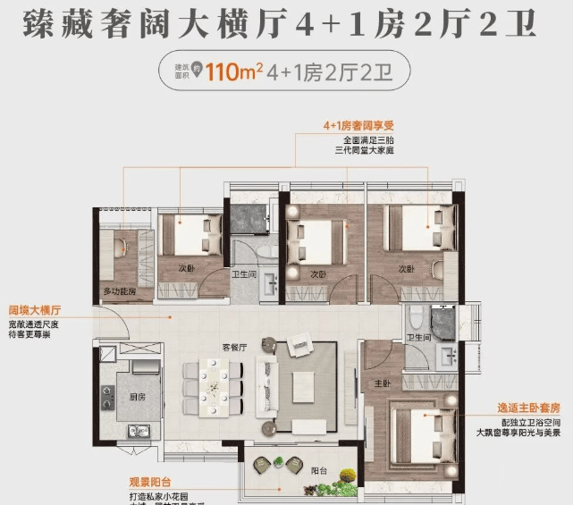 约110㎡五房两卫:奢阔横厅、独立单边位、全南向布局,打造私家小花园,轻松容纳三胎或三代同堂大家庭,性价比远超同级产品。