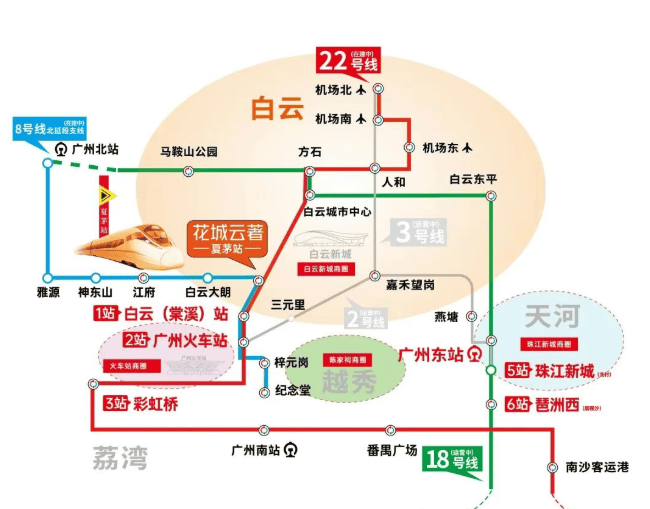 搭乘22号线北延段,1站直达白云站(棠溪TOD),2站抵达越秀区,3站进入老荔湾,换乘18号线仅5站即可抵达珠江新城核心——冼村站。22号线作为广州“南北大动脉”,设计时速高达160公里,贯穿空港、广州火车站、广州南站等7大交通枢纽,全线设16处换乘点,无缝连接全城。