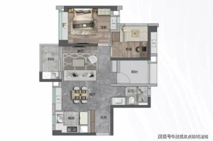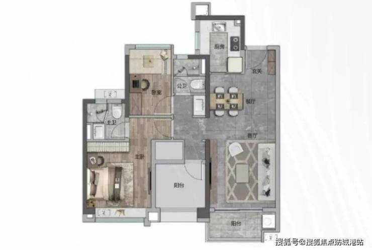 85㎡2+1房:采用横厅设计,客厅配备阳台,餐厅设有飘窗,极大提升了采光效果。赠送面积的阳台可以灵活转换为单人次卧,增加了空间的实用性。