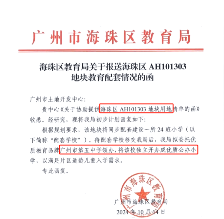 根据海珠区教育局2025年11月17日发布的官方通告显示,海珠区内计划在未来三年开办的部分配套学校中,AH101324地块学校(即绿城馥香园配建小学)由广州市第五中学领办,作为区属公办学校独立开办,纳入广州市第五中学教育集团。此举是海珠区系统构建“未建先融合、开办即优质”新型办学模式的探索和实践,有助于缩短新建学校成熟周期,是海珠区深化教育均衡发展的关键步骤,意在让海珠居民进一步提振对“家门口的好学校”的信心。