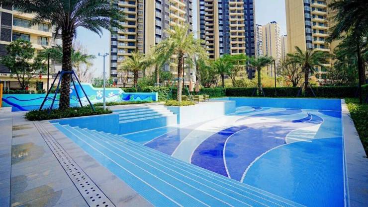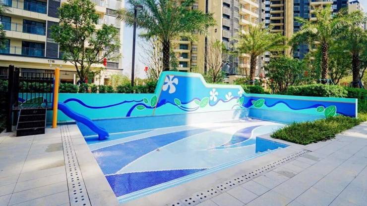 设置全龄户外景观泳池,划分成人泳池及儿童池成人泳池区参照标准泳池,规则矩形,划分泳道,保证实用性更强,并设置休憩平台,为业主提供度假品质的舒适体验,提取当地出名桂花的花纹作为泳池底纹。