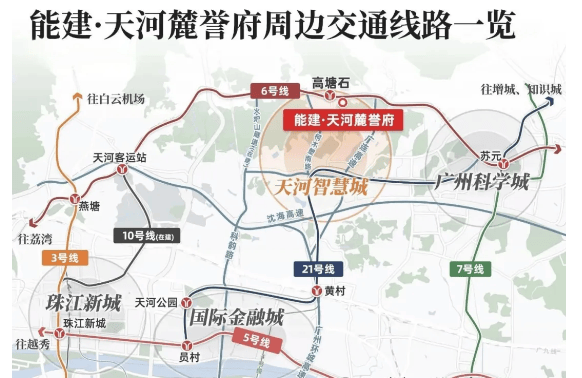 项目位于天河智慧城北部(广汕二路以南、大观北路以北),地处天河与黄埔交界,周边聚集网易、小鹏等 34 家总部企业,超 20 万人才在此工作生活,是天河未来发展重心。交通方面,距地铁 6 号线高塘石站 B 出口仅 800 米,30 分钟直达珠江新城、金融城、琶洲三大 CBD;自驾可通过广汕二路(项目北侧)、广连高速(500 米可达),快速接驳广佛肇高速、广州环城高速,出行高效无忧。