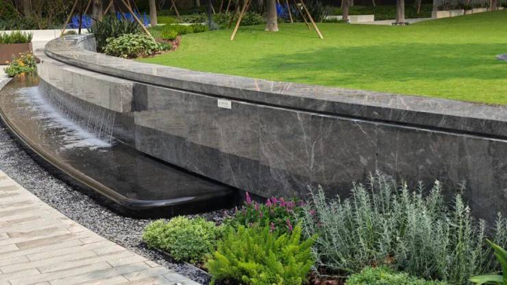 入口广场以大气简洁的特色双层弧形树池水景作为前景的核心景观,真石墙面与干净简练的线条,巧妙地弱化了场地边界感,实现内外渗透,使之不仅仅是一个短暂停留的空间,更是一个充满故事的艺术空间。