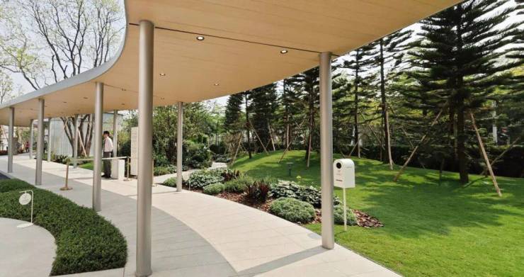 示范区草坪侧设有榕语茶室,将园林引入空间,