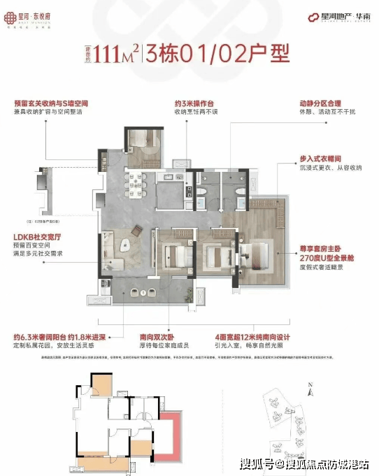 111㎡户型:6.3米大阳台+四开间南向四房,适合家庭居住。