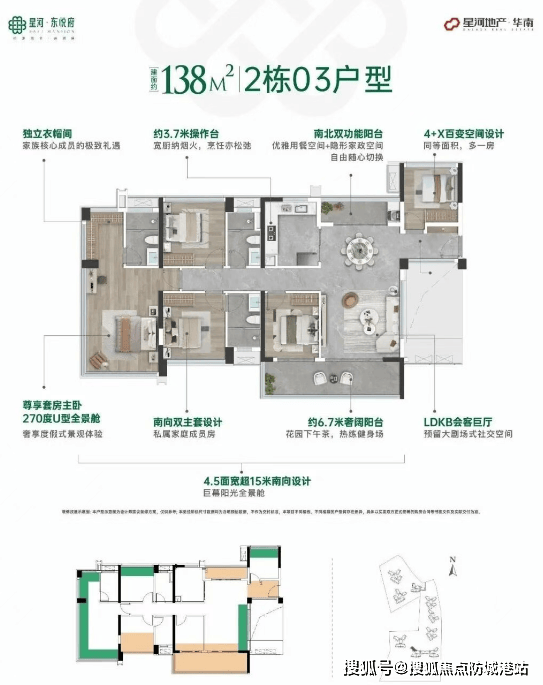 138㎡户型:南北对流+5房双套房设计,满足多代同堂的需求。