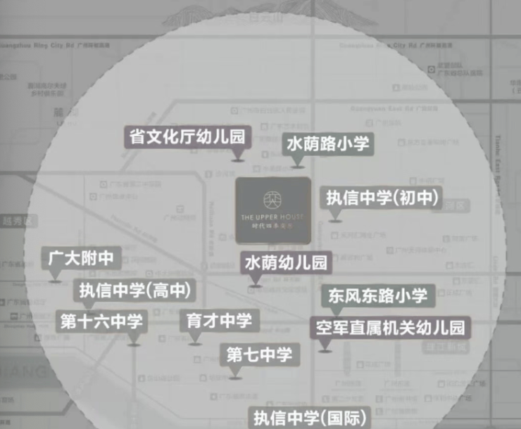 项目地处广州教育强区越秀的核心范围。根据越秀区教育局过往招生地段(具体以项目交付后当年官方公布为准),小学对口八旗二马路小学。中学派位属于越秀区第七组,该组内包含广州市第三中学、广州市第七中学、广州市培正中学、广州市第十六中学等多所省市知名优质中学。周边教育资源高度密集且优质。