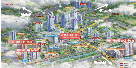 项目生态资源得天独厚,出门 15 米即达 4.5 万㎡滨水公园(万科打造 “水廊花埭”,含亲水平台、运动步道、雕塑公园等),北侧临近花地湾河涌,部分户型可享滨水景观;3 公里内还有醉观公园、荔湾湖公园等,日常散步、亲子活动可亲近自然。作为万科 1 平方公里活力大城的一部分,周边还规划约 30 万㎡总部办公、50 万㎡科创产业集群、17.6 万㎡立体公共空间,未来将形成 “产商住” 一体的新城市中心,既享当下成熟生活氛围,又能承接板块发展红利,宜居属性与增值潜力兼具。