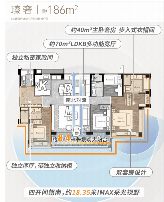 项目作为超新规标杆,户型使用率超 100%,主推 110-180㎡南向滨水三至四房,适配不同改善需求。110㎡户型可改四房,全开间朝南(约 11.3 米采光面),LDK 客餐厨一体化,灵动空间满足家庭成长需求;125㎡三房为改善主力,四开间朝南(约 12.8 米大面宽),IMAX 大方厅 + 科学收纳系统,适配二胎家庭;141㎡四房享滨水景观,约 8.2 米景观阳台 + 270° 全景主卧,视野与尺度兼具;186㎡四房为顶改户型,正南向一线河涌景观,约 18.3 米奢幕采光面 + 80㎡巨幕宽厅,主卧套房堪比酒店总统套,满足高净值家庭需求。