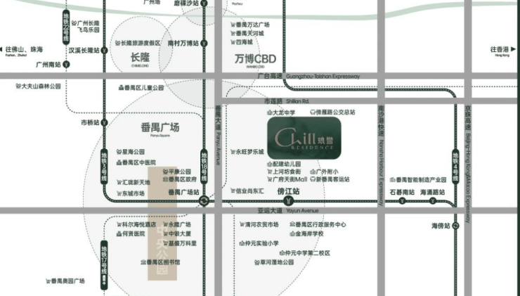 与3号线东延段傍江站直线距离约500米(已开通),从小区出发做地铁去番禺广场只需要一个站,乘坐地铁前往珠江新城也不需要换乘。