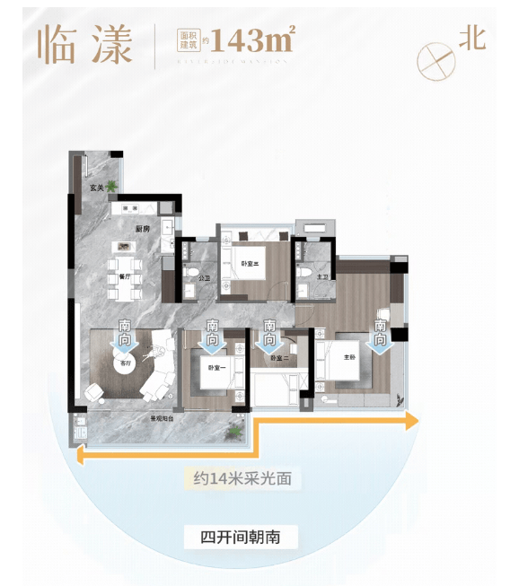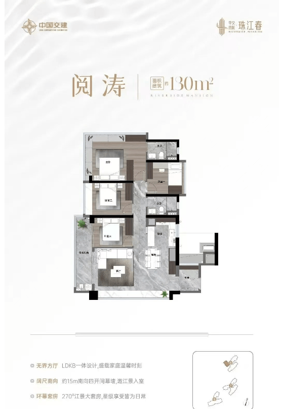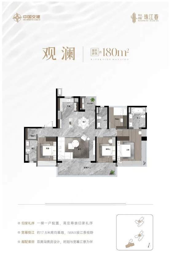 产品力是中交四航·珠江春征服市场的核心武器。首期推出的建面约130至180平方米大平层,专为高阶人群量身定制。建面约130平方米户型,做到了南北通透,拥有约16米的超大南向面宽,景观阳台近7米,让阳光与江景毫无保留地涌入室内;建面约143平方米户型更是惊艳,星级酒店式主卧套房面积达约28平方米,三面采光,大方厅面积约57平方米,尺度感堪比别墅。所有户型均采用全南向或最佳景观朝向设计,推窗即见630米壮阔江景,转身可揽三山绿意,真正实现了“推窗见江,转身遇山”的极致居住体验。在装修标准上,项目毫不吝啬,标配西门子厨电三件套、三星智能门锁、高仪智能马桶以及卫浴界的“劳斯莱斯”杜拉维特洁具。室内墙面采用尼斯木实木护墙板和质感墙布,厨房橱柜运用金属拉丝烤漆工艺,每一处细节都透露出奢华与品味,重新定义了广州江景豪宅的交付标准。