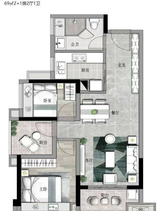 在户型设计方面,本项目主推产品为六十九平方米、七十五平方米、八十二平方米、八十九平方米及一百零六平方米区间的二至三房产品,户型普遍具备“N+1”功能空间,即在固定房间外设置可拓展空间,用于儿童房、书房或储物区,使同等面积获得更高功能承载能力。
