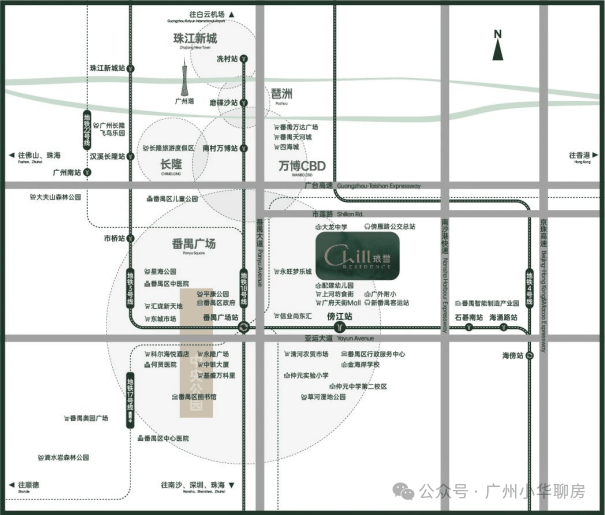 从项目出发,乘坐地铁3号线东延段,一站即可到达番禺广场站,该站点是番禺区核心交通枢纽,汇聚了地铁3号线、18号线、22号线、3号线东延段、17号线(规划中)五轨交汇,实现无缝换乘,通达全城。其中,18号线作为“fast线”,时速可达160公里/小时,两站即可直达珠江新城,通勤时间控制在30分钟内;3号线可直达天河客运站、体育西路等核心商圈,满足业主购物、娱乐、办公等需求;22号线可直达南沙区,便捷连接广州南部区域;规划中的17号线,将进一步完善区域交通路网,提升出行便捷度。