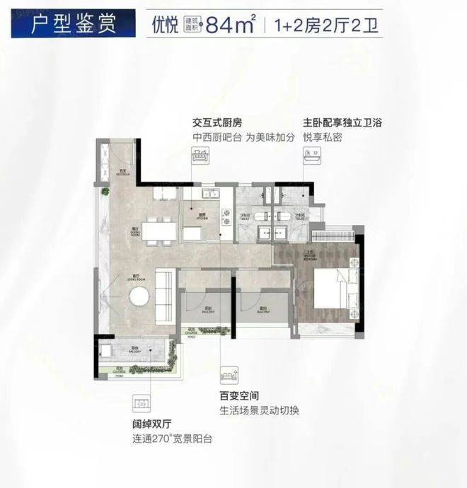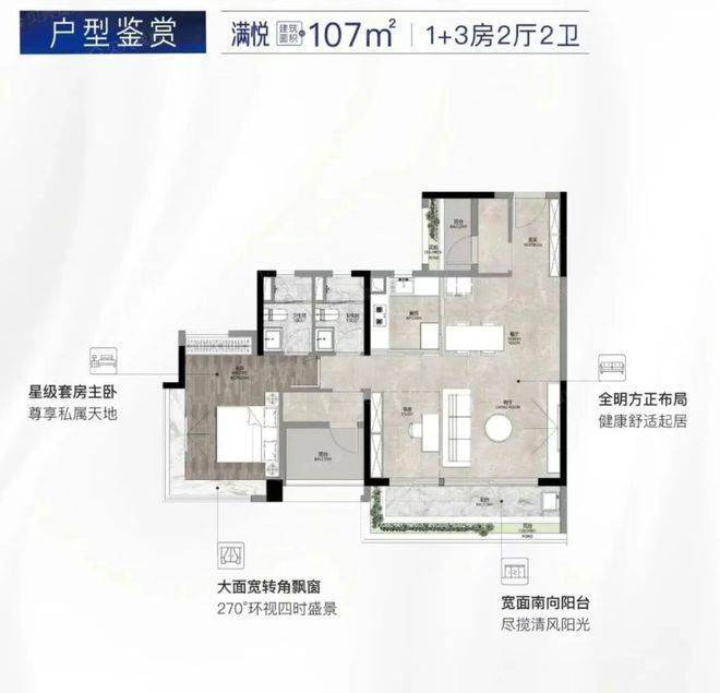 主力户型集中在74㎡到107㎡区间,主要覆盖三房和四房,适合刚需到改善的多种家庭结构。74㎡的三房两卫设计很实用,空间利用率高,有些户型还多送半个卫生间;84㎡左右的户型不少能做到四面朝南,通风采光条件优秀;107㎡的四房则主打舒适,主卧带270度飘窗和大飘窗,阳台做到6米长,观景体验直接拉满。很多户型采用全景天幕玻璃或者大开间设计,实际居住起来的通透感和开阔感很强,动静分区也做得清晰,生活节奏容易拿捏。