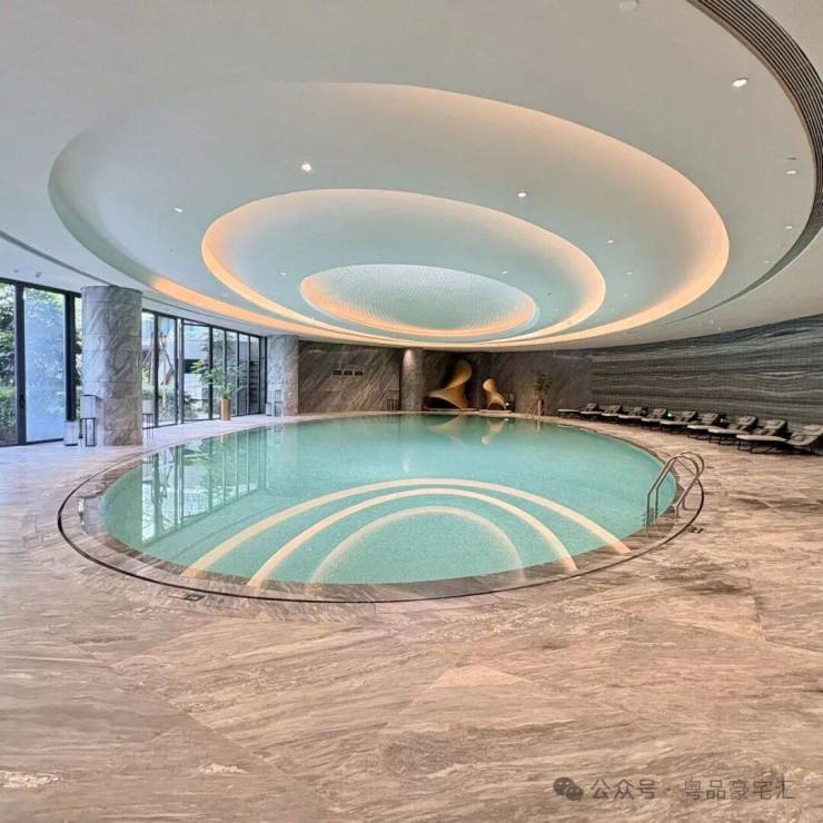 在外立面上,我们重金打造了挑檐铝板与玻璃幕墙的组合,这不仅赋予了建筑现代感与高级感,更使其在阳光下熠熠生辉,成为珠江畔一道亮丽的风景线。在园林设计上,我们引入了沉浸式园林理念,2.7 万㎡的园林景观不仅仅是绿化,更是一个微缩的自然生态系统。下沉式会所、双层图书馆、星幕恒温泳池……这些配套设施的引入,让居住者足不出户便能享受五星级酒店般的尊贵体验。
