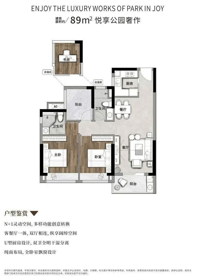 项目主推89㎡与113㎡两种户型,均为纯南向设计,180°直面湖景,无任何高层遮挡。89㎡做到2+1房,餐客一体+全飘窗+主卧套房,实际使用感媲美百平户型;113㎡则采用横厅布局,搭配阔景阳台,实现3+1房,主卧带独立卫浴与衣帽区,满足三代同堂需求。所有户型均采用全飘窗设计,不仅提升采光通风,更拓展了观景与收纳空间。N+1灵动空间可根据家庭阶段灵活改造,从二人世界到四口之家,一步到位,无需换房。