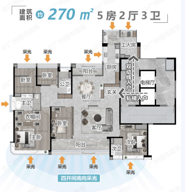 项目在户型设计上充分考虑居住舒适性与美学价值,户型涵盖115-270㎡三至五房,大面宽、全明设计提升空间感和采光效果。住宅组团以中央公园为核心,辅以“绸带公园”串联生活配套,实现室内外自然景观无缝衔接。邀请SOM、SWA、HWCD等国际知名设计机构倾力打造,每一个细节都兼顾功能性和艺术美学,使住户在家中便能享受高品质居住体验和生态景观视野,满足现代高端家庭对空间、采光和私密性的多重需求。