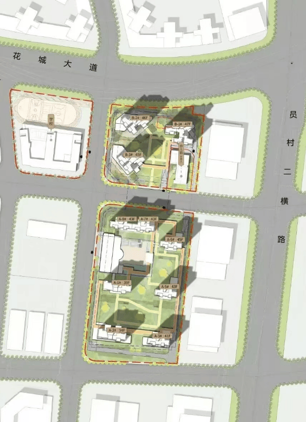 B1-B3栋(北地块):分别为47层、46层、45层的塔楼。
