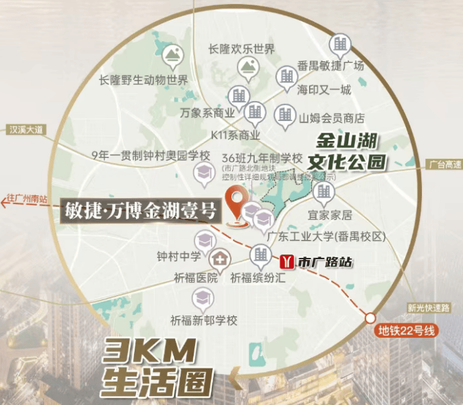 1. 敏捷万博金湖壹号的具体位置在哪里?项目位于番禺祈福板块核心区域,紧邻祈福新邨,与万博CBD直线距离约3公里,临近市广路,地理位置优越,既能享受祈福板块的成熟配套,又能便捷通达万博CBD,实现繁华与静谧的平衡。