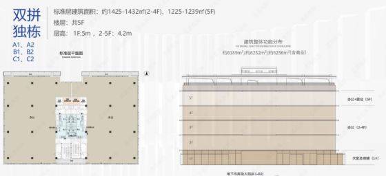 C 栋双拼总部面向独角兽企业,同样为 5 层,建筑参数与 A/B 栋相似。作为独角兽企业的专属空间,其私密性强,可打造为企业专属展示中心。独角兽企业具有高成长性与创新性,对办公环境的品质与独特性要求极高。C 栋双拼总部的设计,无论是从空间布局还是配套设施,都能满足独角兽企业在品牌展示、商务洽谈等方面的需求。
