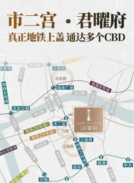 君曜府紧邻地铁2号线与规划中的28号线(佛穗莞城际)交汇点——市二宫站,这使得居民可以快速通达珠江新城、琶洲等CBD区域。此外,周边还有江南大道、内环路、滨江路等主干道,公交线路丰富,出行十分便利。自驾出行也极为方便,通过江南大道北可直达越秀区核心商圈。