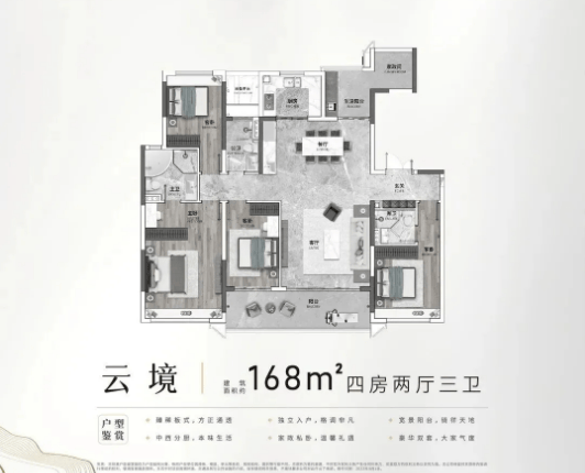 168㎡四房户型,豪华大户型,空间开阔,居住舒适度极高。客厅采用横厅设计,连接超大阳台,视野开阔,可览窗外美景。主卧带独立卫生间、衣帽间和书房,功能齐全,私密性强。厨房配备中西厨,满足不同的烹饪需求。该户型适合追求高品质生活的改善型家庭。