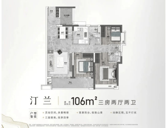 106㎡三房户型,空间更加宽敞,客厅和餐厅相连,营造出开阔的活动空间。厨房采用U型设计,操作空间充足,方便多人协作。主卧带衣帽间和独立卫生间,储物空间充足,居住体验更佳。该户型适合对居住空间有一定要求的三口之家或四口之家。