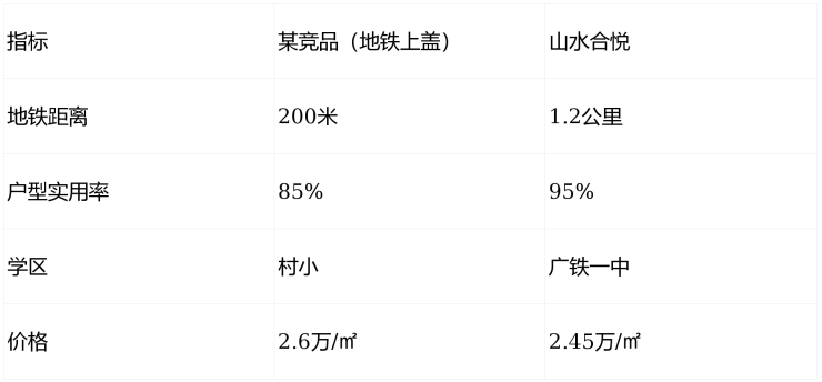 我们以某竞品(地铁上盖)与山水合悦对比: