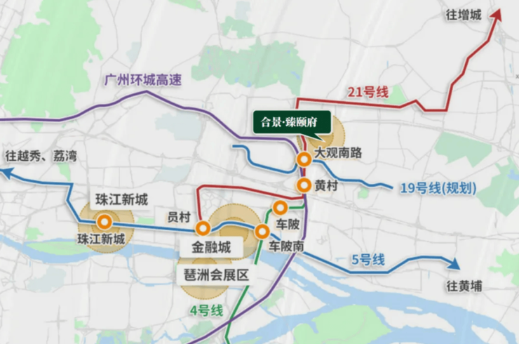 拥有两横两纵三地铁的五维立体交通路网。自驾可轻松抵达珠江新城等核心片区,并通过机场、南站实现城市互联。21 号线智慧城站约 1.5KM,4 号线黄村站约 2KM,19 号线大观南站(规划中,2025 年开通),还有广佛东环线与穗莞深城际轨道在建,交通网络逐步完善,出行便捷。