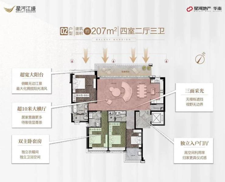 星河江缦周边城市界面目前较差,多为城中村、厂房等,至少近 5 年不会有明显改变 。项目位于广佛交界的地方,连片开发需要较长时间周期 。项目江景朝向为东北向,主阳台为北向,在一定程度上影响采光与日照时长 。不过项目均为大平层设计,可以做到南北对流,弥补了主阳台北向的不足 ,让室内空气保持流通,提升居住舒适度 。
