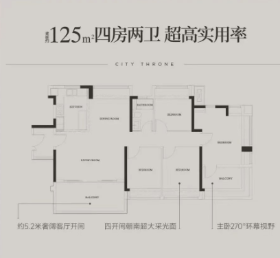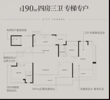 T5 栋楼王为建面约 240㎡四至五房,独栋单边位板楼,南向且三面采光,专梯专户,是广州中轴难得的南向板楼。西边户户型拥有三面景观,可西望白云山,南向俯瞰广州中轴与园林,北向观赏白云山与园景,约 21 米 270° 云山观景面,视觉体验绝佳。
