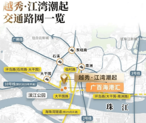 交通方面,距离地铁10号线大干围站仅约650米,便捷连接天河、越秀、海珠、荔湾四大中心区。此外,随着海珠湾隧道的开通,到广州南站通勤时间缩短至约15分钟。环岛路(石岗路-大干围路段)的贯通也大大提升了区域内的通行效率。