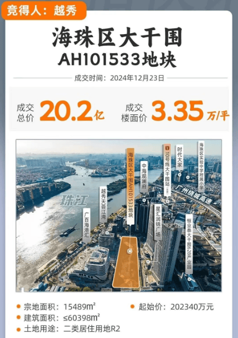 位于广州市海珠区的大干围AH101533地块,由越秀地产于2024年12月以超过20亿的总价竞得。该地块占地面积约1.5万平方米,建筑面积超过6万平方米,楼面价达到每平方米33501元。项目以其优越的地理位置、丰富的配套设施以及独特的设计理念,成为了广州滨江区域的新亮点。