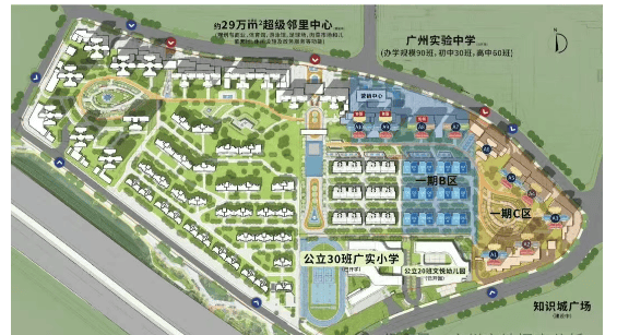 项目最大亮点在于教育配套——自建20班幼儿园与30班小学,后者已正式命名为“广州实验中学附属小学”,于2024年9月开学;初中对口国家级示范性高中标准建设的广州实验中学(初中部已开学),形成“家门口”的12年一贯制公办教育闭环。此外,周边还有华师附中知识城校区(在建)、广州新侨学校等优质教育资源,满足多元升学需求。教育确定性高、师资有保障,成为吸引家庭客群的核心驱动力。