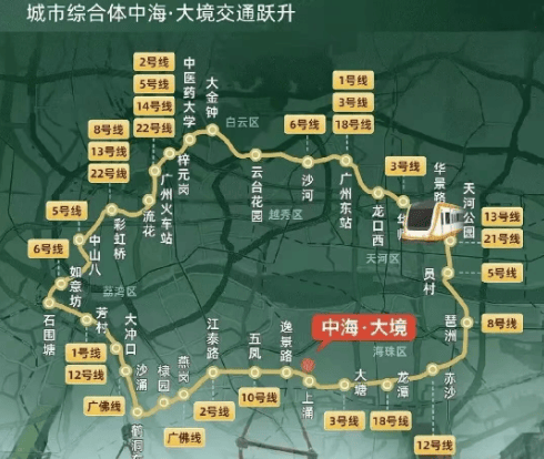 中海大境坐落在广州的城市新中轴线上,这里不仅是天河路和体育西商圈的核心地带,也是未来发展的重点区域。项目紧邻地铁11号线上涌站,这是一条串联广州中心五区的大环线,能够与其他所有地铁线路实现换乘,极大地提升了居民的出行便捷性。此外,周边道路网络发达,自驾出行也十分方便。