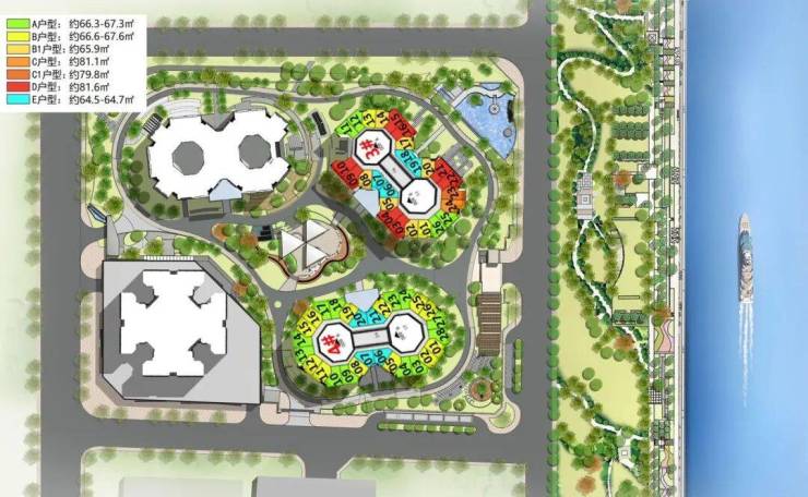 产品建筑面积为64-68平方米的复式产品,使用率高,另外项目为7.15米江景复式产品,有4.65米中空会客厅,透过全落地玻璃幕墙, 极目远眺视野的高度是一般复式所不能媲美的。