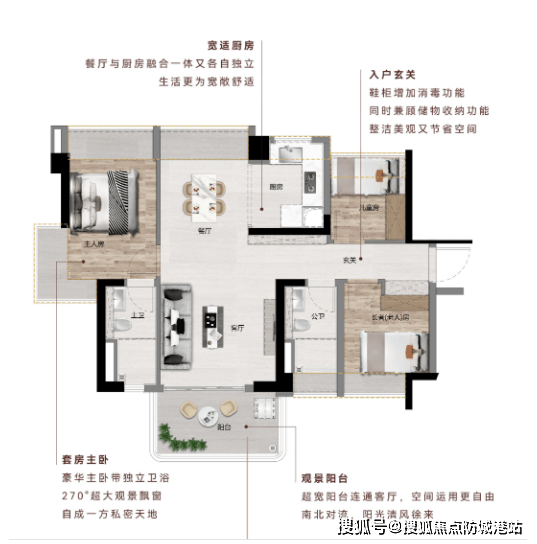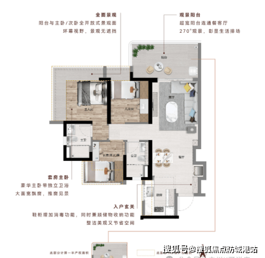 88㎡三房两厅两卫:该户型是项目的主力户型,货量充足,适配刚需家庭与首次置业者,户型设计紧凑实用,南北通透,采光与通风效果极佳。主卧配备270°飘窗与双飘窗,增加了室内的采光与使用空间,同时能够欣赏到优美的景观;U型厨房设计,操作空间充足,动线合理,方便日常烹饪;南向观江景阳台,视野开阔,闲暇时可欣赏江景,晾晒衣物也十分便捷;动静分区设计,休息区与活动区分离,避免相互干扰,提升居住舒适度。
