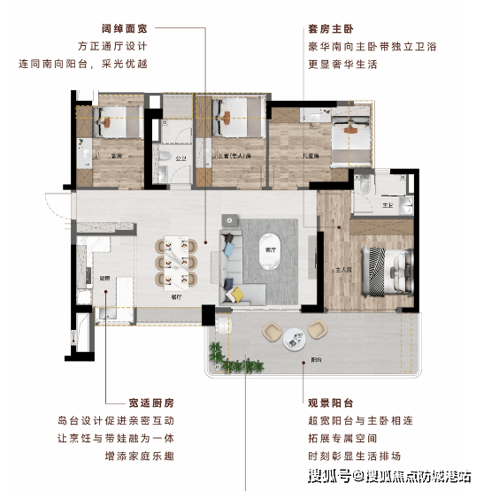 108㎡四房两厅两卫:该户型适配刚需改善家庭,户型设计方正,南向无遮挡,采光充足,能够享受良好的阳光与江景视野。U型厨房设计,操作便捷,满足日常烹饪需求;观景阳台宽敞明亮,视野开阔,可欣赏超广角江景;IMAX版客厅设计,空间宽敞,适合家人聚会、休闲娱乐,同时能够容纳更多家具,提升居住舒适度;四房设计,能够满足多人口家庭的居住需求,可打造儿童房、老人房、书房等,实用性强。