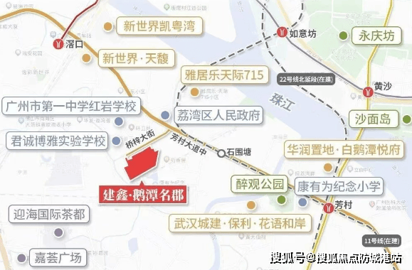 项目距地铁11号线石围塘站D口仅600米(高德地图实测步行8分钟),2站直达如意坊换乘6号线,3站到芳村站接驳1号线/22号线。自驾方面,3分钟上珠江隧道,5分钟直达白鹅潭枢纽(规划中11条轨道交通交汇),形成“30分钟主城生活圈”。
