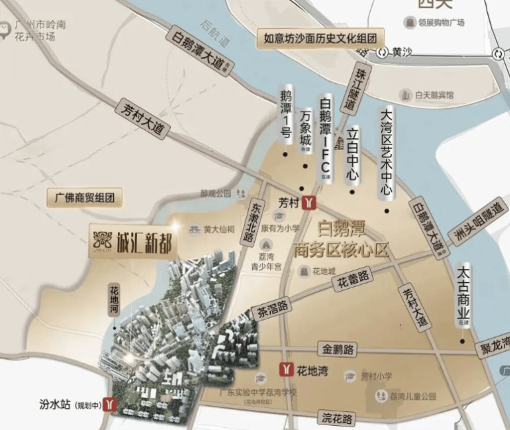 诚汇新都·榕诚湾坐落于白鹅潭商务区核心板块,是主城区罕见的超大规模连片开发项目。项目总占地面积约 54 万平方米,总建筑面积突破 200 万平方米,规划涵盖 16 个高端住宅社区、2 所学校、3 所幼儿园及 60 万平方米高端商业集群。内部采用“一心三脉”组团式布局,融合总部办公、高端商业与生态居住功能,未来将打造为集产业、商业、人居于一体的都会生活 3.0 范本。作为茶滘村旧改重点工程,项目分三期开发,预计 6-8 年完成改造,建成后将成为荔湾新城标杆,涵盖高层住宅、商业办公楼及星级酒店等多元业态。