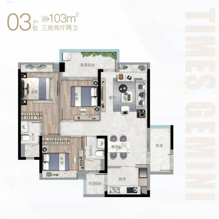 2. **99 - 106㎡舒适三房**:此户型适合中等规模家庭居住。南北通透的设计,使室内空气流通顺畅,营造出舒适宜人的居住环境。主卧套房设计,配备独立卫生间与衣帽间,为您提供私密、舒适的休息空间。次卧与书房空间灵活多变,可根据家庭需求进行调整,满足孩子成长、老人居住或居家办公等不同需求。同时,宽大的阳台连接客厅与卧室,不仅增加了室内采光面积,还为您提供了一个欣赏社区美景的绝佳视角。