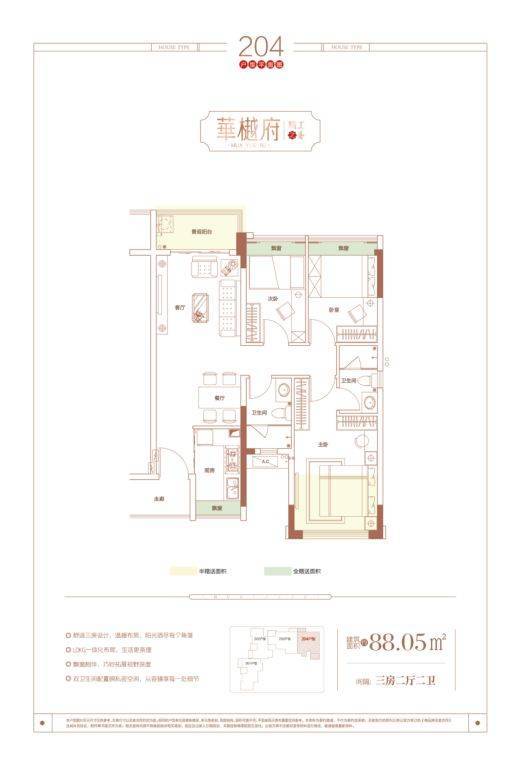 建面约90㎡三房两厅两卫户型,是项目的改善主力户型,适合刚需改善、三口之家升级或小型四口之家居住。该户型最大的亮点是双卫设计、主卧套房,兼顾舒适与私密性,让业主的居住体验更上一层楼。户型方正通透,南北对流,采光通风极佳,彻底解决广州夏季闷热、潮湿的问题,让家居环境更加舒适;主卧套房设计,配备独立卫浴和观景飘窗,空间阔绰,私密性强,业主可以在飘窗处打造休闲、梳妆等功能空间,彰显品质与尊崇;客厅开间宽敞,连接观景阳台,视野开阔,可欣赏社区园林景观,适合家庭聚会、休闲娱乐等多种场景;次卧空间充足,可根据家庭需求灵活改造为儿童房、书房等,满足多元化的居住需求;精细化收纳设计,充分满足家庭的储物需求,让家居环境更加整洁有序,同时公摊少、得房率高,空间利用率极高,小面积也能实现“改善级”居住体验。
