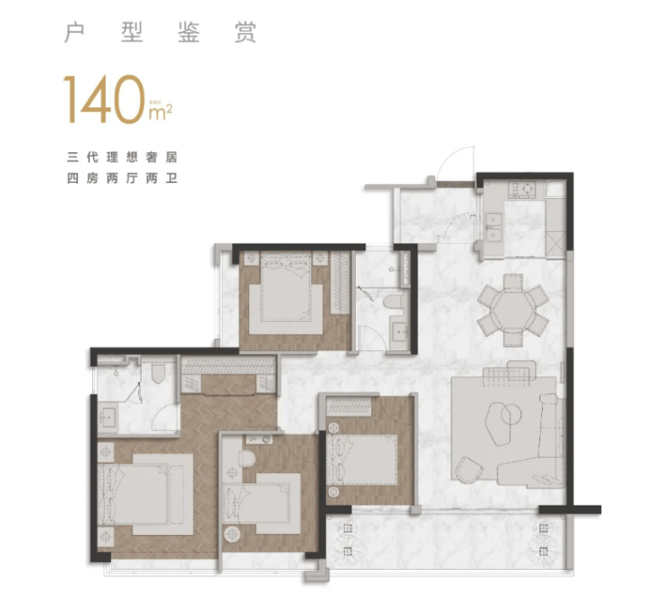 建面约 140㎡四房两厅两卫:三口之家优选,客厅开间约 4.5 米,搭配全景落地窗,采光通风极佳;主卧配备独立卫生间与衣帽间,空间私密宽敞。